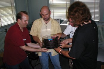 Bob Russell, Bil Herd, Evan Koblentz (MARCH pres.), and Dave Haynie holding the Commodore PET 30th birthday cake.