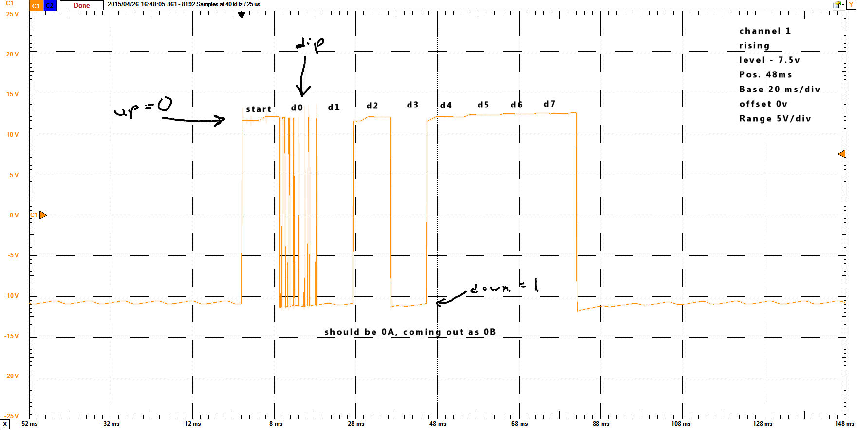 Take a look at this oscilloscope output for an example. Attach RS232 output pins 2&3 to positive, pin 7 to the return. Type a key on the keyboard (or advance the reader) while the Teletype is in LINE mode. With 2 and 3 connected on the RS232 end, you'll get the characters echoed back to the Teletype printer AND the signal will appear on your oscilloscope. The above linked photo has settings you can try. Reply |