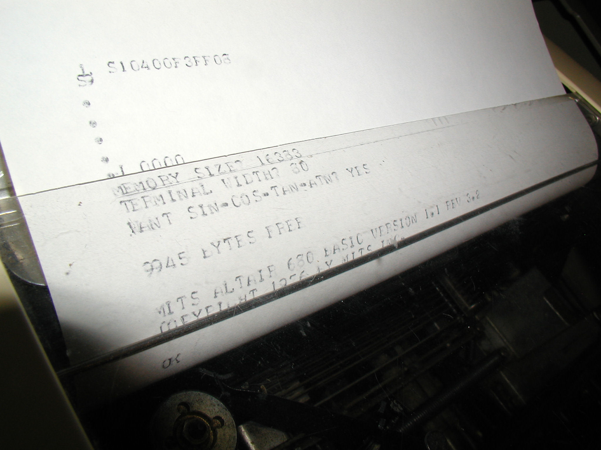 The printout from my Teletype of MITS Altair 680 BASIC initialization. Click image for larger view.