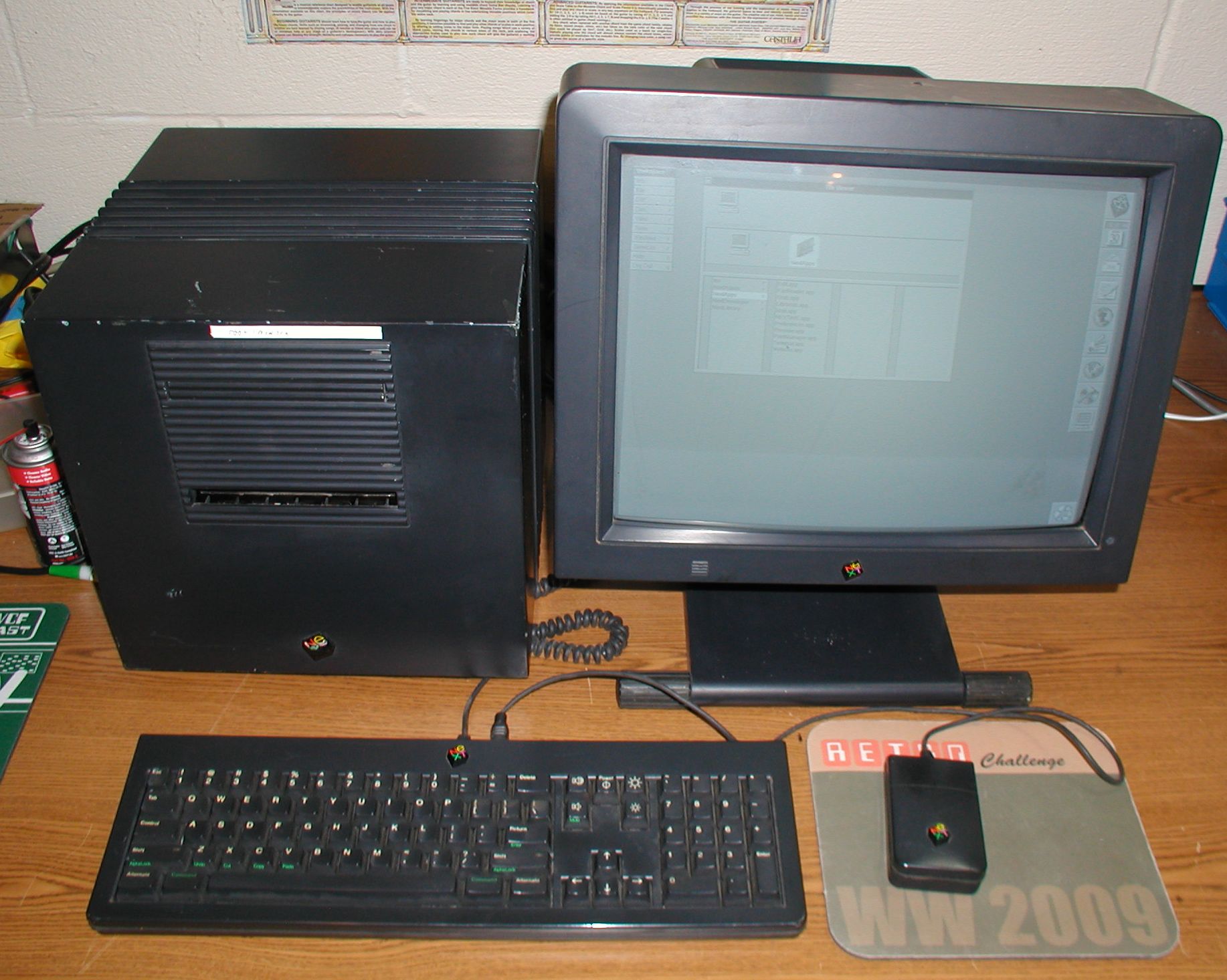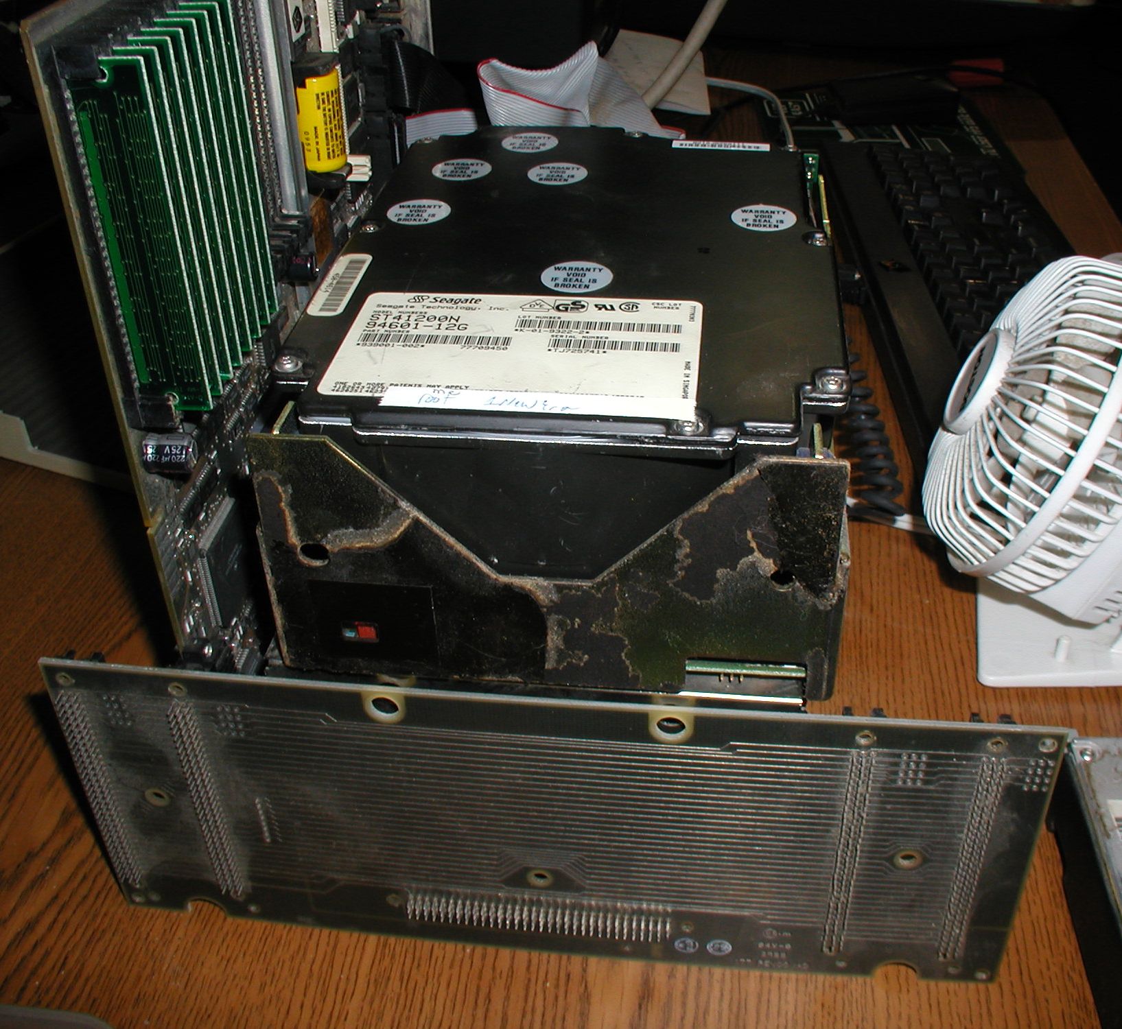 ![]() Here is a view of the NeXT Cube from the front with the chassis, optical drive and inner drive cover removed. The backplane is visible on the bottom with the motherboard (on it's side) and power supply (not visible) plugged into it. The system's internal full-height 5 1/4" hard drive sits unsecured upon the power supply, plugged into the motherboard from the back. The hard drive is an SCSI Seagate ST41200N. Click image for larger view.