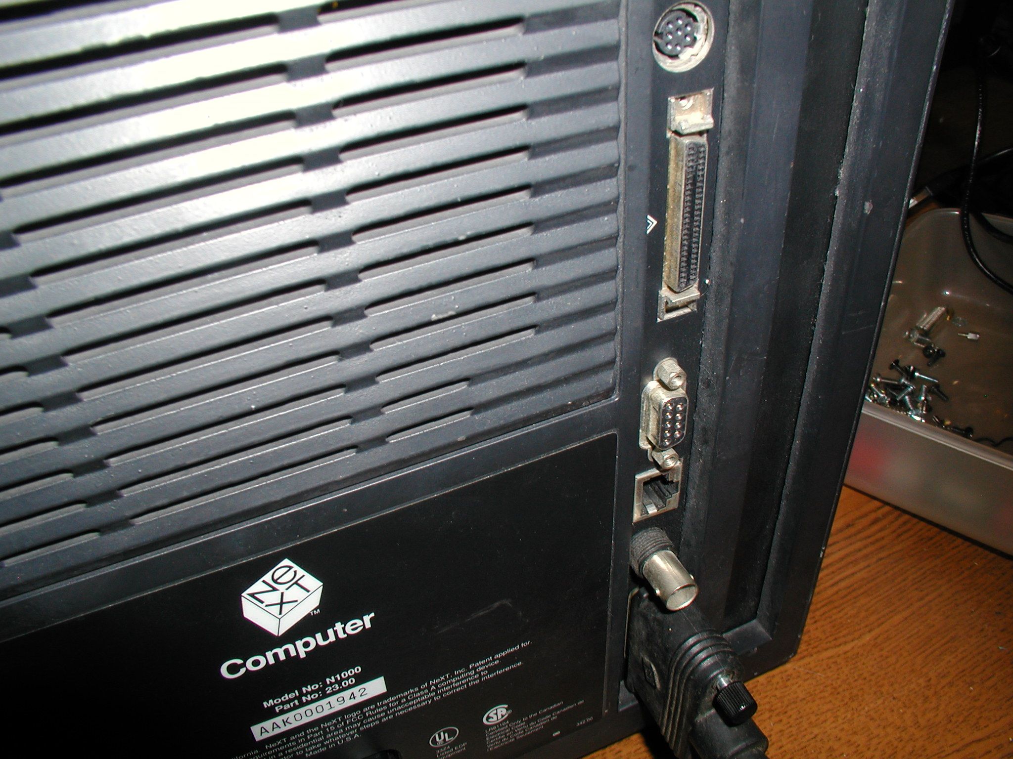 ![]() Closeup view of the NeXT Cube from the rear. The bottom port is used by the display. Note that there is a "regular" ethernet portal, and an external SCSI port. Click image for larger view.