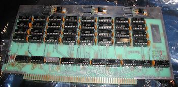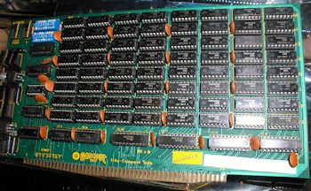 Skipping ahead a few years you see an array of CompuPro "RAM 16" 64K S-100 RAM cards for a CompuPro 8085/8088 system. Highly advanced for 1982/83, this business computer was capable of dual-CPU operations and was compatible with the CP/M, MP/M and even MS DOS (v. 1.25). This model was at the time arguably faster than the IBM PC or most any other CP/M system. Competition from low-priced overseas IBM clones and the overall market preference for IBM PC and compatibles eventually did away with the market for S-100 systems. By 1985 they were mostly gone. Godbout's company rode the S-100 wave until the very end. Click image for larger view.