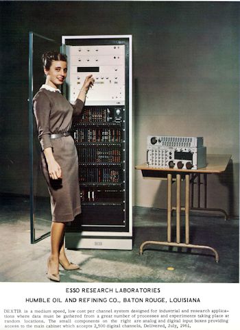 ![]() Beckman Instruments, Inc. made a connected industrial research computer system called the DEXTIR, which was designed for to prepare data for computer entry. The model pictured in this photo was installed at the ESSO Research Labs in Baton Rouge, LA in July 1961. Click image for larger view.