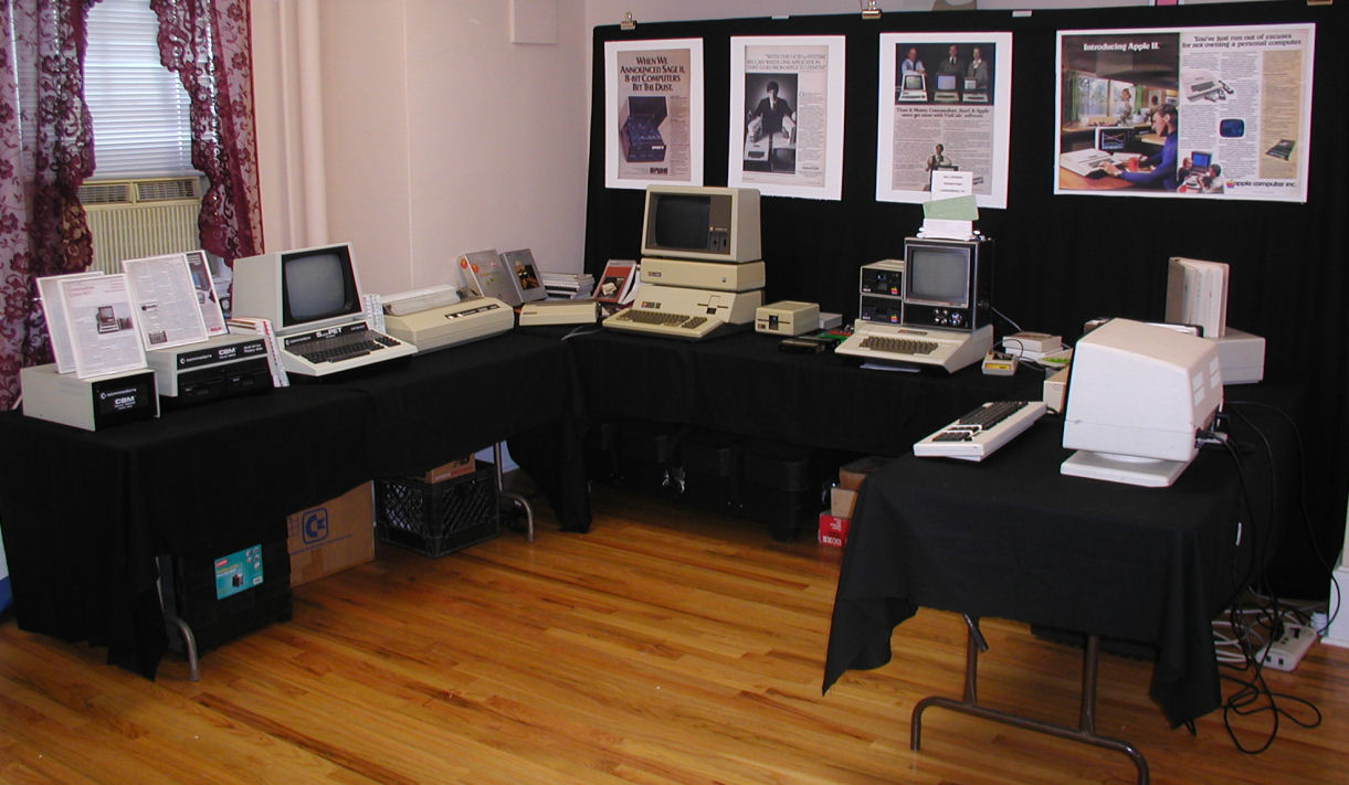 Here is my exhibit. Included was a Commodore SuperPET, Apple ///, Apple ][, and a Sage II computer. The focus of the exhibit was programming. I wrote a Waterloo Pascal trivia quiz program for the SuperPet, and a biorhythm program in Applesoft Basic for the Apple ][. Click image for larger version